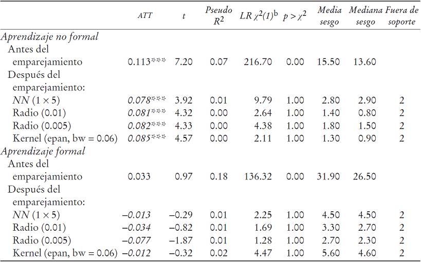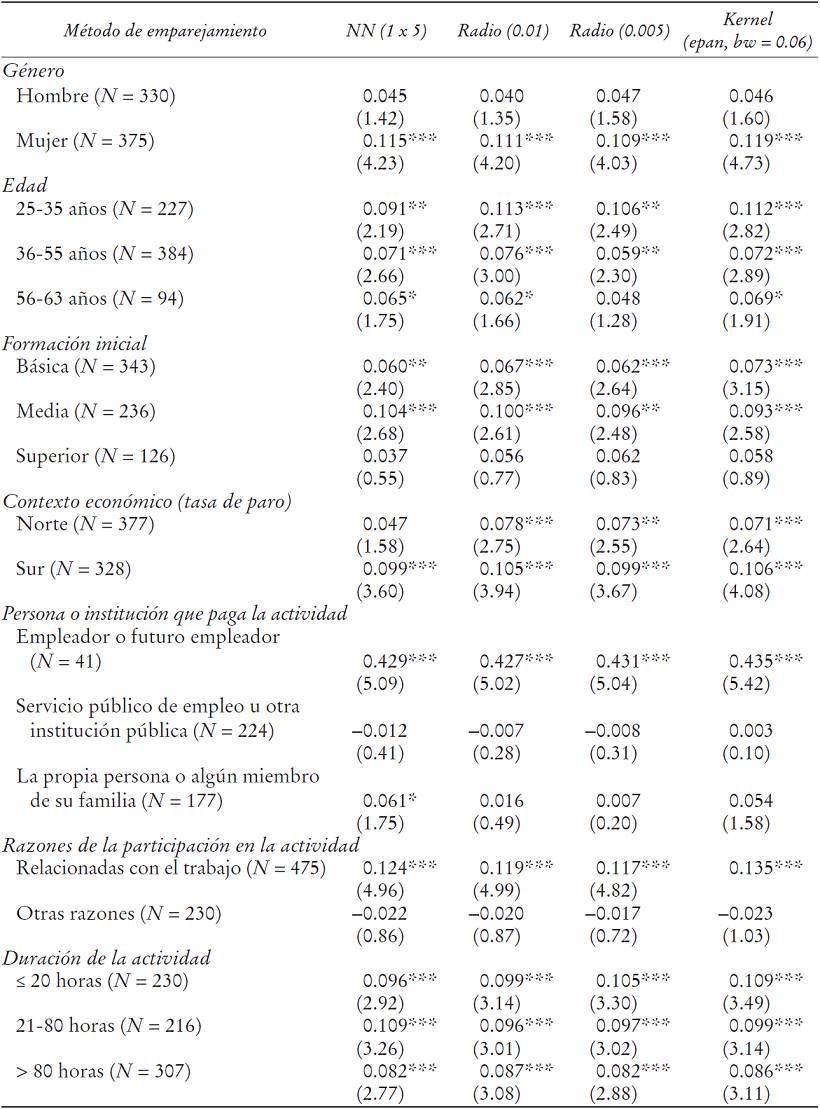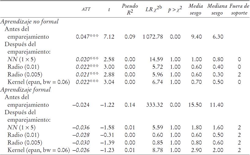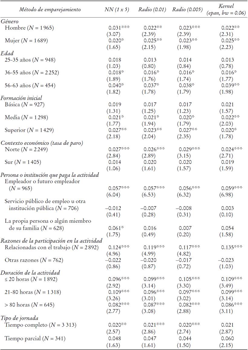 Para los empleados, el impacto de las actividades de aprendizaje formal tampoco es significativo, pero los resultados son más robustos al método de emparejamiento utilizado, obteniéndose estimaciones que van de -0.026 a -0.036. De nuevo, el signo es negativo al igual que en el colectivo de los desempleados y la calidad del emparejamiento muy alta.