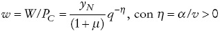 y de tR y tM , respectivamente (véase la subsección 1 del Apéndice). A raíz de este supuesto, los cambios en q resultan únicamente de modificaciones en el valor de los salarios en moneda extranjera (W/E). Finalmente, asumimos que la ponderación relativa de R y M en PC es proporcional a la que rige para PT ; vale decir, que α /β = v/(1− v). Bajo este supuesto, obtenemos una relación inversa entre el nivel del tipo de cambio real y el del salario real.