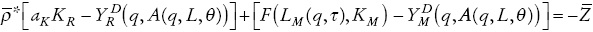 El comportamiento de las ofertas sectoriales lo estilizamos de la siguiente manera: la producción de R utiliza capital, pero no requiere trabajo. Por simplicidad, se representa mediante una función de producción con un coeficiente capital-producto fijo. M se produce con una función de producción estándar, con derivadas parciales positivas respecto a sus dos insumos: capital y trabajo. La producción de N se representa con una función con coeficientes fijos para capital y trabajo, siendo el último el factor limitante.