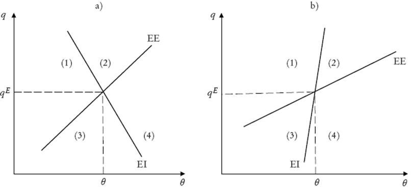 La Gráfica 1 describe en el plano q − θ las condiciones de equilibrio interno (EI) y equilibrio externo (EE). En la subsección 4 del Apéndice se derivan las pendientes de las curvas. En la Gráfica 1a se caracteriza el caso en que el efecto de tipo de cambio real sobre la absorción doméstica es neutro o expansivo ( Aq ≥ 0) y en la Gráfica 1b aquel en que el tipo de cambio real afecta negativamente a la absorción doméstica (Aq < 0). Como es habitual en el enfoque Salter-Swan, las gráficas se dividen en cuatro cuadrantes: (1) superávit con desempleo, (2) superávit con sobreempleo, (3) déficit con desempleo y (4) déficit con sobreempleo. En nuestra historia no serán de interés los casos (2) y (4).