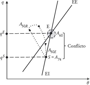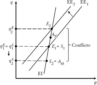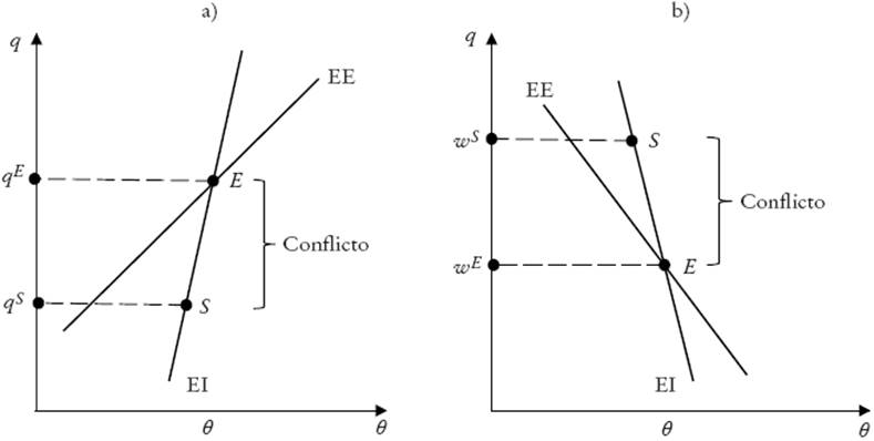 Definimos conflicto distributivo estructural como la existencia de una brecha positiva entre qE y qS. Una economía es estructuralmente conflictiva cuando el salario real que permite el equilibrio social es superior al requerido para garantizar la sostenibilidad de las cuentas externas y el pleno empleo. La Gráfica 2a caracteriza el caso de conflicto distributivo estructural en el plano q−θ y la gráfica 2b en el plano w-θ.En ambas, E representa el punto de equilibrio macroeconómico y S el de equilibrio social. En la sección II representamos con Ai la ubicación de corto plazo de la economía para el periodo i.