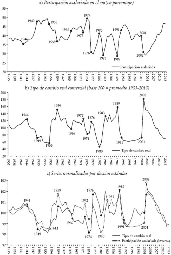 En la Gráfica 3 trazamos la evolución de las variables con la que caracterizamos el conflicto distributivo estructural. En nuestro modelo, los movimientos del salario real (w) y del tipo de cambio real (q) tienen implicaciones distributivas. Por ello, en la Gráfica 3a desplegamos la evolución de la participación de los asalariados en el ingreso calculada por (Lindenboim et al., 2010) y en la Gráfica 3b, el tipo de cambio real comercial para el periodo 1935-2013.4 Como el periodo que cubrimos es prolongado y los salarios reales aumentaron gracias al crecimiento de la productividad, es más apropiado emplear la participación asalariada como proxy empírica del salario real, w, de nuestro modelo estático. Así, es fácil observar la relación inversa que hay entre las dos variables en el corto plazo, cuando la productividad puede considerarse dada. La estrecha relación entre ambas variables se percibe todavía con mayor claridad en la Gráfica 3c, en la que el tipo de cambio real se presenta junto a la inversa de la participación salarial, o lo que es similar, con la participación de los capitalistas y cuentapropistas en el ingreso agregado. Como ambas series tienen diferente varianza, la Gráfica 3c presenta las series normalizadas por sus respectivos desvíos estándar en un índice 100 igual al promedio de 1935-2013. La Gráfica 3 es el soporte empírico de la relación inversa entre w y q de la ecuación (10) de nuestro modelo. Marcamos en esa gráfica algunos años que son relevantes en nuestra narrativa.