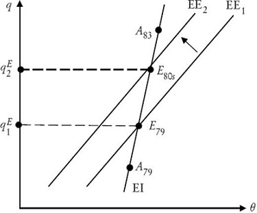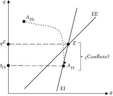 La pendiente de la curva de EE surge de diferenciar totalmente la expresión (18) y evaluarla en el plano q − θ.