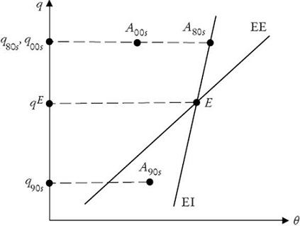 La Gráfica 7 representa los distintos estados de la economía argentina entre 1983 y comienzos de los años 2000. En la década de 1980 (A80s), la economía se encontraba en una situación de pleno empleo y un nivel de tipo de cambio real por encima del equilibrio macroeconómico, definido ese equilibrio bajo condiciones “normales” de financiamiento externo y de términos del intercambio. No es posible percatarse de la existencia de conflicto estructural porque la economía permanece con un nivel de tipo de cambio real más alto que qE . Tampoco es posible percibir el conflicto estructural en la década de 1990 (A90s ). Que el tipo de cambio real fuese menor a qE podría sugerir que el salario real efectivo estuviera próximo al de equilibrio social. ¿Era q90s = qS ? Dada la popularidad de la convertibilidad entre quienes preservaban su empleo es posible que así fuera. Pero como la economía se encontraba en desempleo (a la izquierda de EI), tampoco este estado es de conflicto estructural. Por último, en los primeros años 2000, la economía (A00s ) combinaba un nivel de tipo de cambio real mayor al del equilibrio macroeconómico -similar en los hechos al promedio de la década de 1980- y alto desempleo (a la izquierda de EI). Tampoco en estas condiciones puede manifestarse el conflicto estructural. Por estas razones, el punto S no aparece en la Gráfica 7.