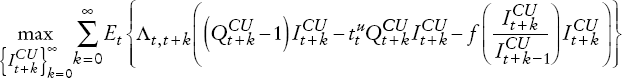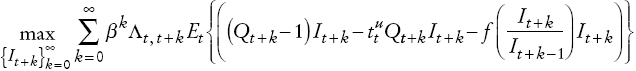 (A11)En otras palabras, la firma productora de bienes de capital obtiene una ganancia por invertir en cada periodo de (Qt −1)It menos los costos de ajuste f(It /It−1). Por último