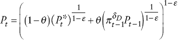 (A14)donde MCt+k son los costos marginales de la empresa de retail. En particular, en cada periodo una firma está dispuesta a ajustar sus precios con probabilidad (1 − θ ). Entre esos periodos, la firma está dispuesta a indexar parcialmente (es decir, δD ∈[0,1]) su precio a la tasa de inflación pasada. Con estos supuestos, el nivel de precios evoluciona de acuerdo con