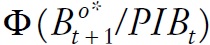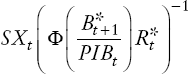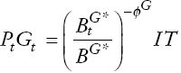 (3)Gobierno. La regla fiscal establece que el gasto depende de los ingresos estructurales IT, más un ajuste por exceso de deuda pública. En otras palabras, si esta deuda es consistente con su valor de largo plazo BG* , entonces el valor del gasto fiscal es igual a los ingresos estructurales IT.