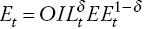 (A23)donde, OILt es el combustible y EEt es la energía eléctrica. De este modo, dado un cierto nivel de producción, y por tanto de energía total (Et ), se pueden obtener por separado las demandas de combustible y de energía eléctrica en función de los respectivos precios. En términos logarítmicos se asume que el precio de la energía eléctrica sigue la siguiente forma: