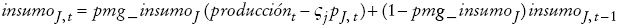 Ajustes en el modelo.18 Para mejorar el ajuste del modelo DSGE se supuso que existen rezagos en las respuestas de la demanda de todos los insumos en el sector de bienes intermedio y de cobre. De esta manera, la demanda por un insumo genérico j que se denomina insumoJ,t (“log linealizada”), además de depender positivamente del nivel de producción, producciónt y negativamente del precio del insumo, expresado en términos reales, el cual se denomina pJ,t , también depende de un rezago, insumoJ,t−1. Además, los precios responden menos de lo esperado al ponderarse por un parámetro ςj. Todos estos parámetros de ajuste son estimados: