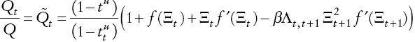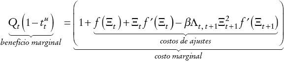 De la ecuación (A11) del Apéndice, que es la versión dinámica de la ecuación (3), se obtiene la condición de primer orden, la cual establece que se invierte hasta el punto que los beneficios netos de impuestos igualan a los costos marginales.