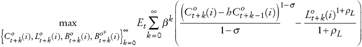 (A1)El coeficiente σ > 0 mide la aversión al riesgo y ρL mide la desutilidad de trabajar; el inverso de este parámetro es también el inverso en la elasticidad de las horas trabajadas al salario real. h mide la formación de hábito para captar la dinámica del consumo. Para modelar mejor la dinámica del consumo se adicionó en forma ad hoc los ingresos laborales esperados en la ecuación de Euler de los optimizadores.