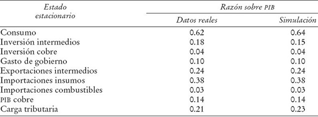 En la calibración se replicó el estado estacionario o equilibrio de largo plazo de la economía chilena, medido, por ejemplo, por la razones, como consumo al PIB, inversión al PIB o gasto del gobierno al PIB, entre otras.