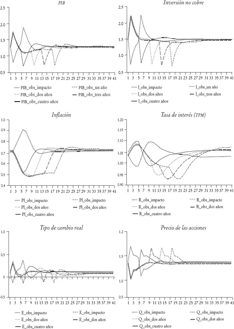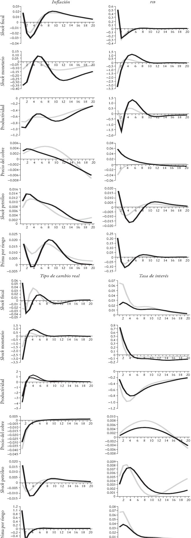 En resumen, si bien existen algunas particularidades en los impulsosrespuesta en el muy corto plazo (dos a tres trimestres), producto de la alta persistencia de la tasa de interés, en el mediano plazo los shocks producen los efectos esperados.
