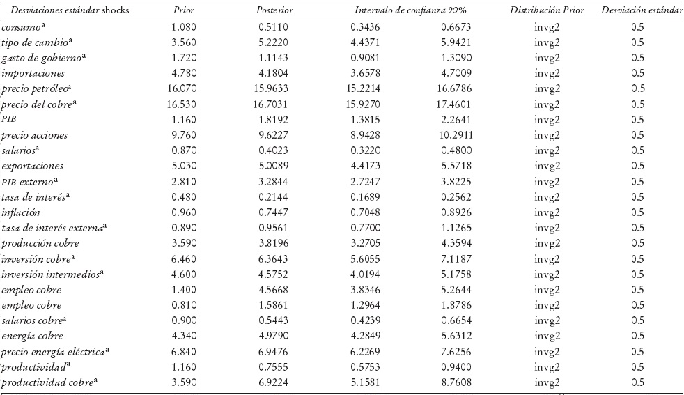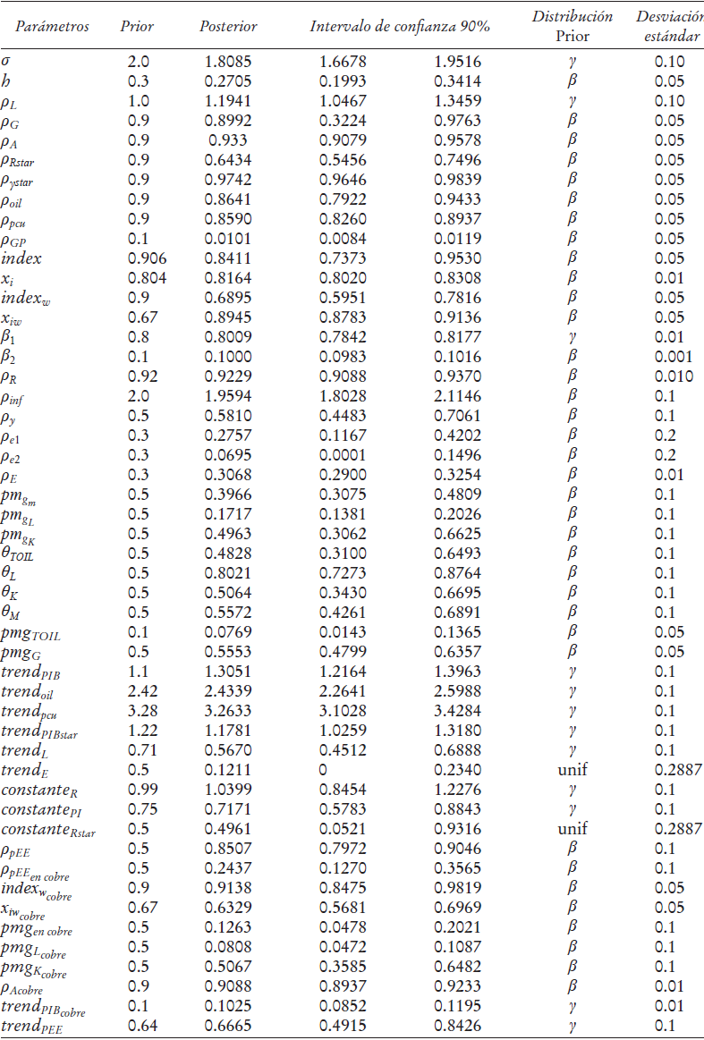 En términos generales, el modelo macro DSGE se estima con econometría bayesiana, por lo cual se deben establecer priors sobre la distribución de los parámetros (valores priors) y luego, mediante técnicas econométricas estándares (máxima verosimilitud) y réplicas (simulación), se obtienen las distribuciones de los posteriores o estimaciones finales. Los priors de los parámetros estimados fueron tomados de la literatura tradicional de modelos macros (García y González, 2014).10 Para asegurarse de la calidad de las estimaciones, se realizan dos estimaciones independientes con un número alto de réplicas y se observa que en ambas la distribución de los parámetros converjan a valores similares (véase inciso 2 del Apéndice).