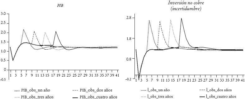 Por otra parte, es importante dejar claro que este último análisis sobre los efectos de la incertidumbre17 es sólo una aproximación. Como bien establecen (García et al., 2011), una forma adecuada para incluir incertidumbre en un modelo de este tamaño para analizar política fiscal es mediante una aproximación de segundo orden. Sin embargo, el problema radica en que la estimación bayesiana del modelo se torna demasiado compleja si se realiza una aproximación de segundo orden al modelo. Mejoramientos a esta limitación se dejan para ser desarrollados en futuras investigaciones.