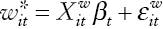 son los vectores de características observables que afectan al salario y las horas trabajadas del individuo i en el momento t, respectivamente. De esta manera, w* y L* son variables latentes; sólo se observarán valores si el individuo efectivamente trabaja.