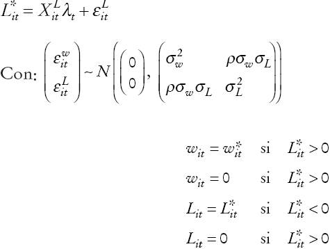 (9)donde wit representa los valores observados del individuo i en el momento t del salario horario, y Lit su homólogo de las horas trabajadas, mientras que