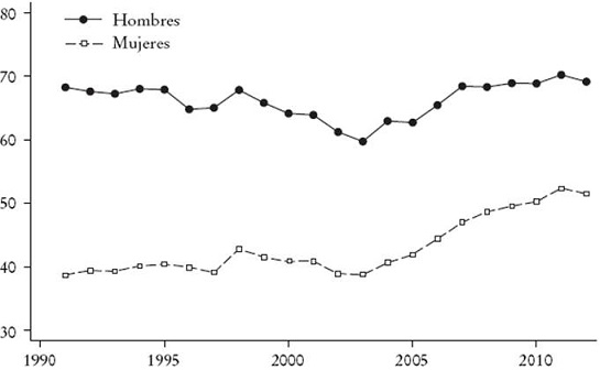 En las últimas décadas se ha registrado un importante aumento de la tasa de participación femenina en el mercado de trabajo en todo el mundo. En América Latina, durante la segunda mitad del siglo XX se han incorporado al mercado laboral aproximadamente 70 millones de mujeres, lo cual es reflejo de la importante transformación que ha tenido el papel económico de las mujeres en la región (Chioda, 2011). Siguiendo a Gasparini et al. (2000), el aumento de la cantidad de mujeres empleadas tendría efectos sobre la pobreza y la desigualdad, al menos a través de dos canales. Por un lado, debido a que un mayor número de personas tiene ingresos laborales positivos, es decir, a la menor cantidad de individuos con ingreso cero, lo cual produciría una reducción de la cantidad de personas pobres y una caída en la desigualdad. Por otro lado, dependiendo del grupo socioeconómico al que pertenecen las mujeres que consiguen empleo, podría producirse que la desigualdad aumente a pesar de que la pobreza disminuya o se mantenga estable.