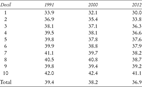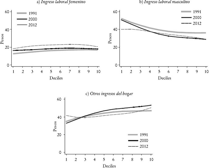 Estos elementos tienen como contrapartida una disminución del peso del ingreso laboral masculino en el ingreso total para todos los deciles entre 1991 y 2012, junto con un aumento del peso de otros ingresos en los hogares de deciles extremos y una caída de su participación en los hogares ubicados entre el segundo y séptimo deciles.