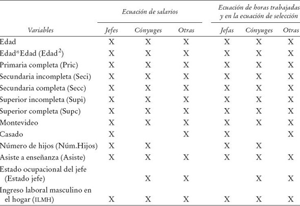Debido a que la posición que ocupan los individuos dentro del hogar afecta sus decisiones de empleo, siguiendo a Bourguigon et al. (1998), la muestra se parte en tres grupos y se estima en forma separada para jefas, cónyuges y otras. Si bien la mayoría de las variables explicativas contempladas en cada uno de los modelos coinciden, se incorporan variables particulares para cada caso. De este modo, para cada uno de estos grupos, y para cada año, se estima una ecuación de salarios y otra de oferta laboral. En el Cuadro 5 se resumen las variables que componen los vectores