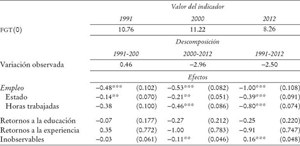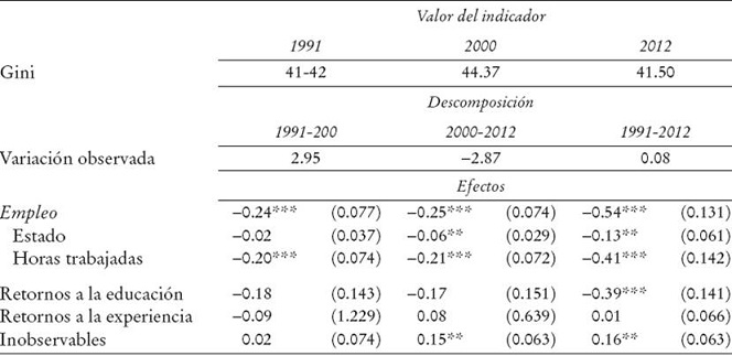Finalmente, al estudiar todo el periodo bajo análisis, se encuentra que la desigualdad se mostró casi idéntica entre 1991 y 2012. Sin embargo, la contribución del empleo femenino a la desigualdad, tanto del efecto estado como del efecto horas, entre los dos extremos del periodo fue siempre negativa, de −0.13 y −0.41 a un nivel de significación estadística de 5 y 1%, respectivamente.