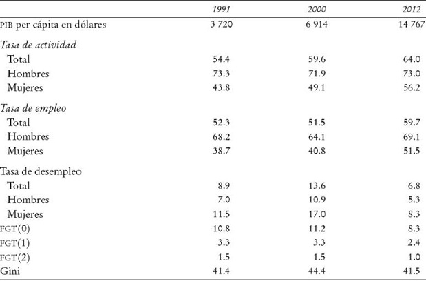 En Uruguay, en las últimas décadas, tanto la participación de la mujer en el mercado de trabajo como la distribución del ingreso y la pobreza han sufrido variaciones importantes. Sin pretender establecer una relación causal, en este apartado se presenta evidencia sobre los fenómenos a analizar a lo largo del artículo. El análisis se concentra en el periodo 1991-2012, con especial énfasis en los años 1991, 2000 y 2012, para los cuales se presenta información resumida sobre la evolución de la distribución del ingreso y el empleo femenino. El objetivo es trabajar con un periodo relativamente largo que permita capturar cambios en el comportamiento de las mujeres que se dan en forma gradual; de lo contrario no se esperaría encontrar efectos al realizar las microdescomposiciones. Debido a la sensibilidad de la metodología elegida, no es conveniente tomar como años de referencia para las comparaciones aquellos en los cuales se hayan producido eventos infrecuentes y que, por ello, no resulten comparables. Por tanto, se eligió trabajar con el periodo más largo posible, para el cual las encuestas de hogares son públicas y resultan semejantes dada la forma de recolección de la información, tomando como año de cierre 2012, el último para el cual se contaba con información al momento de realizar esta investigación, y como año intermedio de comparación el 2000, suficientemente lejano a la crisis ocurrida en Uruguay durante el 2002.