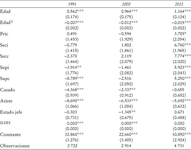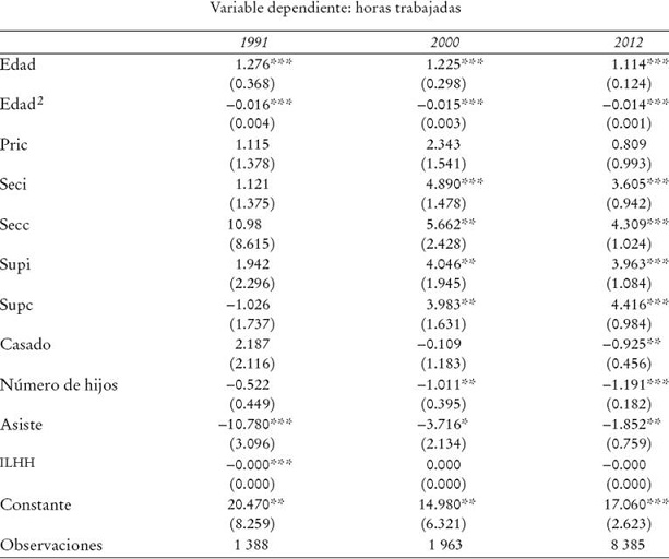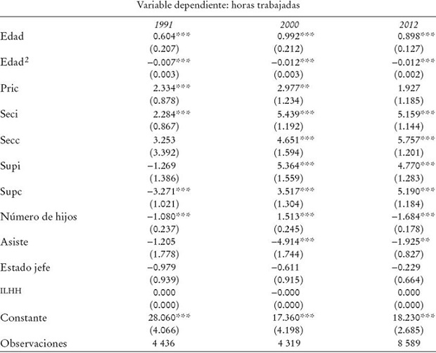 La estimación de la ecuación de salarios horarios se realiza mediante el método de selección de Heckman por máxima verosimilitud, coincidiendo la ecuación de selección con la de horas semanales trabajadas, con la diferencia de que se sustituye la variable dependiente de horas trabajadas por una variable dummy que adopta el valor de 1 cuando el individuo trabaja y de 0 en caso contrario. Para efectos de evitar problemas de identificación, la ecuación de selección debe contener al menos una variable explicativa que no resulte relevante al momento de explicar el salario; en este caso se incluyeron el ingreso laboral de los hombres del hogar (ILHH), el estado de ocupación del jefe (en los casos que corresponde) y la condición de si asiste a un centro de enseñanza. Por su parte, la ecuación de horas trabajadas se estima mediante un modelo Tobit estándar para datos censurados.