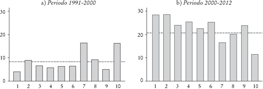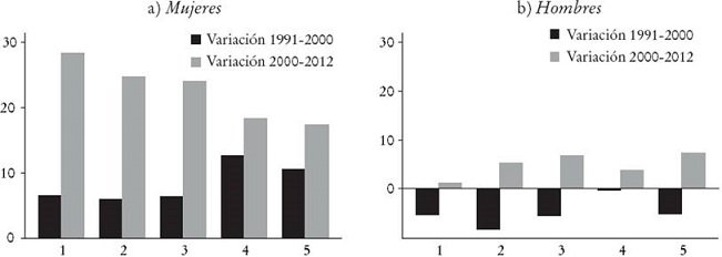 La evolución de la tasa de empleo femenina no ha sido homogénea si se agrupa a la población de acuerdo con distintas variables. Distinguiendo entre dos subperiodos: 1991-2000 y 2000-2012, en las Gráficas 5a) y 5b) puede observarse la variación de la TEF según el decil de ingresos del hogar al que pertenecen las mujeres. La línea horizontal es indicativa de la variación de la TEF promedio. A partir de dichas gráficas puede apreciarse que, entre 1991 y 2000, las mujeres pertenecientes a hogares del primer decil de ingresos tuvieron un aumento de su tasa de empleo de 4%, registrando una variación menor al promedio (8.2%), mientras que las mujeres pertenecientes a los hogares más ricos fueron, junto con las del séptimo decil, quienes registraron el mayor crecimiento de su tasa de empleo, 16.2%, ocho puntos porcentuales superior al promedio. Este escenario se revierte en el subperiodo siguiente. Entre 2000 y 2012, las mujeres que mostraron un mayor crecimiento de su tasa de ocupación fueron aquellas pertenecientes a hogares de los dos deciles más pobres (28% aproximadamente), mientras que las pertenecientes al decil más rico, si bien aumentaron su nivel de ocupación (11.5%), lo hicieron por debajo del promedio general (20.6%).