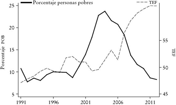 En las Gráficas 3 y 4 se ilustra la evolución de dos dimensiones de la distribución del ingreso en forma conjunta con la tasa de empleo de las mujeres. Las oscilaciones de los indicadores han mostrado diferentes tendencias entre 1991 y 2012, pudiendo diferenciar dos subperiodos. En lo que respecta a la evolución de la pobreza se observa que, luego de una caída en 1992, comienza a incrementarse lentamente hasta que a finales de la década de 1990 sufre un drástico aumento. Esto condujo a que en 2004 cerca de 25% de la población se encontrase por debajo de la línea de pobreza. Sin embargo, después del pico registrado en dicho año, la tendencia de la tasa de incidencia de la pobreza se revierte, ubicándose en 2012 en 8.2%, el valor más bajo de los últimos 20 años.