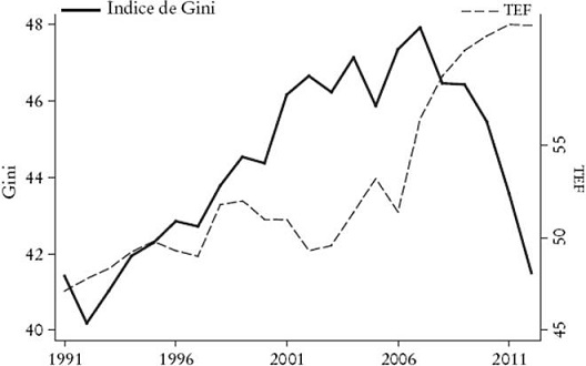 Por su parte, la desigualdad, aproximada por el índice de Gini, ha mostrado una evolución similar a la de la pobreza, pero con sus particularidades. A partir del año 1992 se inició una etapa de fuerte crecimiento de la concentración del ingreso, la cual alcanzó sus valores máximos en 2007. La desigualdad, a diferencia de la pobreza que aumentó especialmente a finales de la década de 1990, mostró una tasa de crecimiento constante durante toda la década y, recién en 2007, tres años más tarde que la pobreza, comenzó a registrar variaciones negativas.