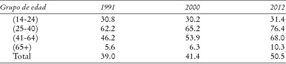 En el Cuadro 2 se desagrega la información sobre la situación de empleo de las mujeres de acuerdo con el grupo etario al que pertenecen. A tales efectos se distinguen cuatro grupos: mujeres de entre 14 y 24 años de edad; de entre 25 y 40; de entre 41 y 64, y de 65 y más. El segundo grupo es el que muestra en todos los periodos una mayor tasa de empleo, seguido por el tercer grupo, mientras que las menores tasas las registran las mayores de 65 años. Al mismo tiempo, al considerar las variaciones de las tasas específicas, se puede observar que la TEF aumentó en mayor medida para los grupos más envejecidos. De hecho, el único caso en que se registró una leve variación negativa fue para las mujeres de entre 14 y 24 años entre 1991 y 2000.