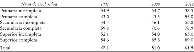 Otra forma de distinguir grupos dentro del total de mujeres es de acuerdo con el máximo nivel educativo alcanzado. De este modo, en el Cuadro 3 se muestra la TEF según nivel educativo para las mujeres de entre 14 y 64 años de edad. En primer lugar, se destaca la relación positiva entre nivel educativo y tasa de empleo, la cual es persistente a lo largo del tiempo. Por otra parte, puede observarse que la tasa de empleo no varió en forma homogénea si se distingue por grupo educativo. Las mujeres con educación superior o universitaria completa fueron las que registraron en todos los casos la mayor tasa de empleo y, al mismo tiempo, fueron quienes mostraron el menor crecimiento relativo en la ocupación entre 1991 y 2012. En el otro extremo, las mujeres con primaria incompleta registraron en todos los años la menor tasa de ocupación. Sin embargo, mientras entre 1991 y 2000 tuvieron una leve caída de su tasa de empleo, entre 2000 y 2012 aumentaron su ocupación 10%. Si se considera todo el periodo analizado, las mujeres con primaria y secundaria completa fueron quienes mostraron el mayor crecimiento de su tasa de empleo, de aproximadamente 28%.
