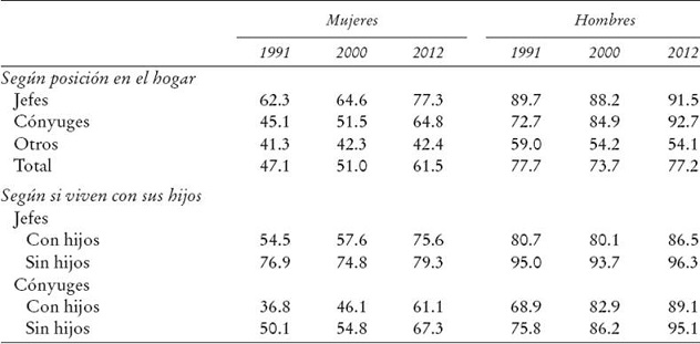 Finalmente, en el Cuadro 4 se distinguen grupos de mujeres y de hombres de acuerdo con el papel que ocupan dentro del hogar, es decir: jefes, cónyuges u otros, y según si viven con sus hijos o no.3 Si bien las jefas y los jefes de hogar son los que en promedio tienen una tasa de empleo superior a la del resto de los grupos, el mayor crecimiento se evidenció en los grupos de cónyuges, tanto de hombres como de mujeres, quienes pasaron de registrar guarismos por debajo del promedio en 1991 a superarlo en 2012; de hecho, entre los hombres los cónyuges fueron el grupo que mostró la mayor tasa de empleo en 2012. Por su parte, las mujeres y hombres que integran el resto de los integrantes del hogar (otros) han mostrado una tasa de empleo bastante estable. Al distinguir según si viven o no con sus hijos, se observa que quienes aumentaron en mayor medida su tasa de empleo fueron las mujeres con hijos, en particular entre 2000 y 2012, donde tanto las jefas como las cónyuges que viven con sus hijos registraron una variación de su tasa de empleo superior a 30%.