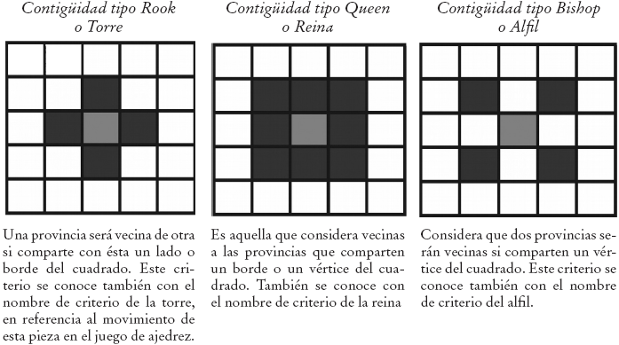 Para verificar la existencia o ausencia de autocorrelación espacial, se pueden utilizar diferentes índices, siendo el I de Moran el más conocido y utilizado en la práctica (Sánchez Rivero, 2008). Este índice (Moran, 1950) mide el grado de concentración de valores altos/bajos de una variable en el entorno geográfico de cada una de las observaciones de la muestra. Para cada valor del estadístico es posible realizar una inferencia para evaluar el nivel de significatividad estadística de rechazo de la hipótesis nula de ausencia de similitud o disimilitud de valores de una localización geográfica. Varía entre los valores −1 y +1; cuanto más cercano a 1 sea el indicador, mayor será el nivel de autocorrelación espacial (Sánchez Rivero, 2008). En el cálculo del I de Moran resulta determinante la definición de vecindad de las unidades espaciales consideradas que se utilice, que en el caso del presente artículo se trata de las provincias españolas. Para ello, se utiliza un ponderador espacial que surge de una matriz de contigüidad que toma valores de uno para provincias adyacentes y de cero para los casos contrarios. Los principales criterios de vecindad son (Sánchez Moral, 2004; Anselin, 2005; Sánchez Rivero, 2008): contigüidad tipo Rook, tipo Queen y tipo Bishop (explicados a continuación). Los tres tipos de vecindad presentados reflejan vecindad de primer orden, pero es posible considerar también contigüidad de segundo orden (cuando se considera la influencia de los vecinos de los vecinos), de tercer orden, y así sucesivamente. Tras una revisión de estudios en los que se aplica el I de Moran al estudio de la autocorrelación espacial en España se observa un uso mayoritario de la vecindad de primer orden tipo reina (Sánchez Moral, 2004, 2008; Buendía et al., 2012), por lo que será la que se aplique en el presente estudio.