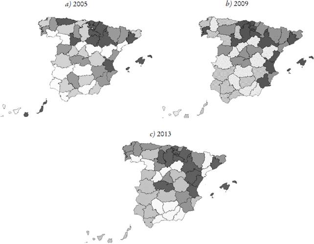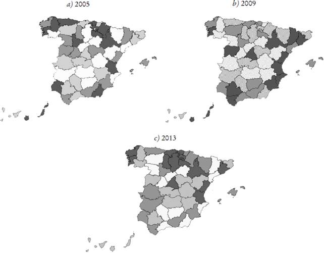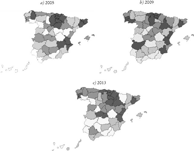 El análisis del comportamiento de los mismos durante el periodo de estudio (2005-2013) muestra que, a nivel global, existe una mayor concentración de concursos en la parte superior de la diagonal marcada por el eje noroeste-sureste, con especial incidencia en las provincias del este y noreste del país (Mapa 1a, 1b y 1c). El análisis por años muestra pequeños cambios, esto es, no siempre las provincias permanecen en el mismo cuartil. Aunque se verifica una persistencia generalizada, destaca el hecho de que provincias como Vizcaya, Barcelona, Baleares y Valencia se encuentren en el cuarto cuartil durante todo el periodo (tanto en las gráficas que se presentan como en las que no). También presentan valores altos a lo largo del periodo de análisis La Rioja, Álava, Guipúzcoa, Navarra, Huesca y Zaragoza. En el otro extremo se observa que las provincias extremeñas, algunas provincias andaluzas como Almería, Granada o Málaga, y Ávila y Ciudad Real se mueven persistentemente entre el primer y segundo cuartil.