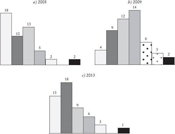 El histograma clasifica la variable en siete categorías. Sobre cada barra aparece el número de provincias que se encuentra en cada categoría (Gráfica 1a, 1b y 1c). El análisis del histograma analiza si la función de densidad de la variable se aproxima o no a una normal (presentamos sólo el histograma para los años 2005, 2009 y 2013, siguiendo la misma filosofía que en el apartado anterior). Los datos obtenidos ponen de manifiesto el papel determinante de la crisis económica española sobre la declaración de los concursos de acreedores, ya que a partir del año 2009 el histograma revela un cambio hacia una distribución normal con la aparición de la crisis. Asimismo, hemos realizado el mismo análisis para los sectores industrial y de construcción (no se presentan por razones de espacio) y constatamos que si bien el corrimiento hacia la normalidad se produce a nivel global y para el sector de la construcción en 2008, en el caso del sector industrial comienza a producirse en 2009. Esto puede explicarse en el hecho de que en el sector industrial las repercusiones negativas de la crisis se han visto más tarde que a nivel global.