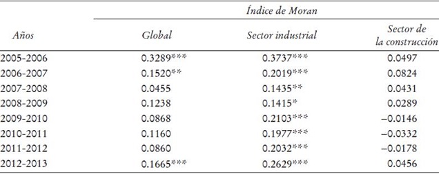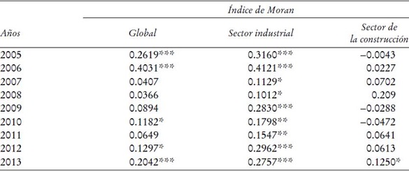a) Autocorrelación espacial. El análisis de dependencia o autocorrelación espacial se realiza utilizando el índice I de Moran global. Para su cálculo se utilizó la matriz de pesos con criterio de vecindad de primer nivel tipo reina. Tras un primer resultado se excluyeron los valores extremos, lo que no varió el resultado del índice y se aplicaron 999 permutaciones. El Cuadro 1 muestra los I de Moran obtenidos a nivel global y de los sectores industrial y de la construcción, por separado, así como su nivel de significatividad.