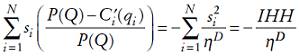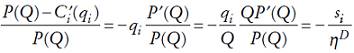 (1)donde i = 1,..., N. Ahora bien, denotando por ηD la elasticidad de la demanda respecto al precio y por si la participación de la empresa i en el mercado, se sigue de la ecuación (1) que en un equilibrio de Cournot se tiene que, para cada empresa,