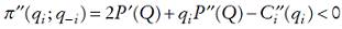 (4)donde la desigualdad tiene que ser satisfecha en todo el dominio de la función inversa de la demanda. La otra condición, mucho más obvia, y también omitida por los autores del libro de texto citado, es que para que el equilibrio sea en verdad óptimo debe satisfacer la condición de segundo orden dada por: