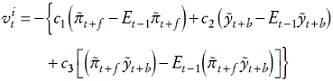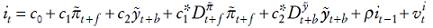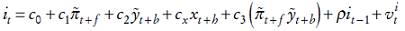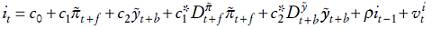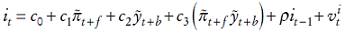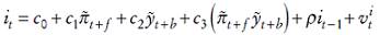 (7)Es decir, sustituimos los valores esperados por los realizados y permitimos que el modelo sea backward looking o forward looking, de forma que los subíndices temporales f y b pueden ser positivos o negativos, e introducimos el término ρit−1 , que refleja el fenómeno conocido como interest-rate smoothing.4
