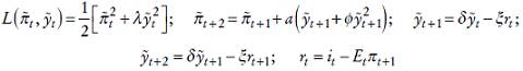 Siguiendo a Dolado, et al. (2005), partimos del problema de optimización al que se enfrenta la autoridad monetaria: la minimización de su función de pérdidas -ecuación (1)-, sujeta a la estructura de la economía, representada ésta por una curva IS -ecuación (2)- y por una curva de oferta agregada o curva de Phillips, que puede adoptar una forma no lineal -ecuación (3)-.