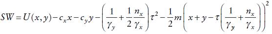 En este aspecto se asume que el gobierno puede asignar un valor monetario a los costos sociales generados por la contaminación. Por lo tanto, si D(e) = 1/2 me2, con e = ex + ey , representa el daño ambiental (en términos monetarios), podemos expresar la función agregada de bienestar social, SW, como la suma de: i) el excedente de los consumidores, ii) los beneficios de la industria nacional y iii) los ingresos del gobierno (es decir, GR = τe), menos iv) el daño ambiental. Entonces, reemplazando por las respectivas expresiones, usando (5b), (7a) y (7b), obtenemos:12,13
