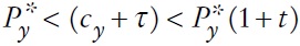 (7b)donde (7a) implica que el precio del bien debe igualar el costo-marginal efectivo y (7b) que el impuesto ambiental debe igualar el costo marginal de la actividad de reducir el nivel de emisiones. Entonces, reemplazando por (7a) y (7b), la función de beneficio de la firma extranjera puede ser expresada de la siguiente manera: Πy (τ) = 1/2τ2/γy . Nótese que, en contraste con la expresión para las firmas nacionales, los beneficios están generados sólo por la actividad de contaminación evitada.
