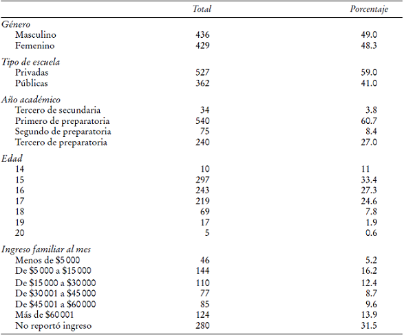 En el Cuadro 1 se muestran algunas de las características descriptivas sobre la composición de la muestra por género, tipo de escuela, año académico, edad e ingreso familiar; 96.2% de la muestra se encuentra cursando la preparatoria y el resto cursan el último año de la secundaria, mientras que 93.1% de los encuestados tiene entre 15 y 18 años de edad. La composición por género es muy homogénea, 49% hombres y 48.3% mujeres (el resto no contestó). En términos de la heterogeneidad de escuelas, 59% se encuentra en escuela privada mientras que 41% en pública.