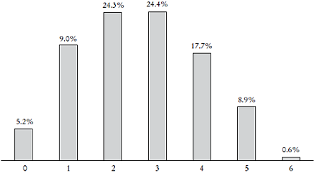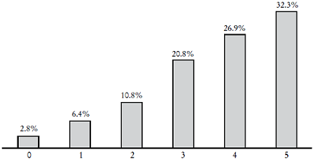 En la Gráfica 10 se reportan los resultados sobre este componente y la media de aciertos correctos fue 3.6 de 5. Un tercera parte de los encuestados respondió de manera correcta todos los reactivos y sólo una quinta parte respondió correctamente menos de tres preguntas.