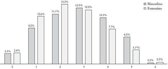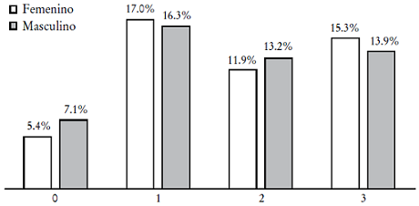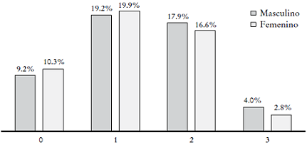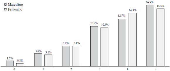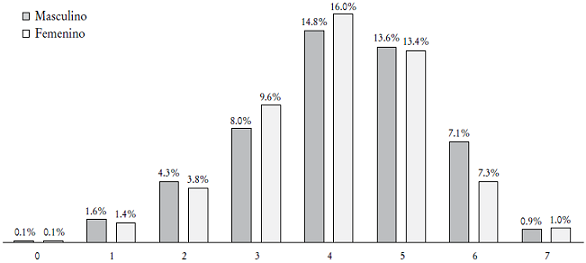 En la Gráfica 5 se reportan los resultados por género, y es interesante observar que la incidencia de respuestas positivas en el segmento de tres a siete reactivos es mayor en el caso de las mujeres, aunque son los hombres quienes obtienen los mayores aciertos positivos en el caso de seis y siete reactivos.