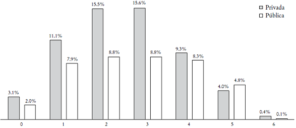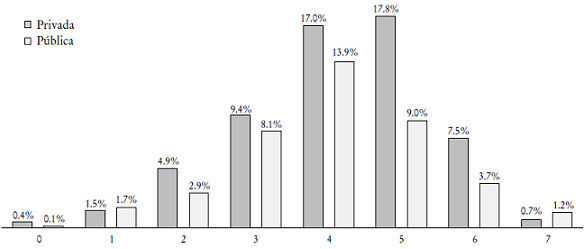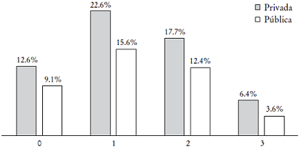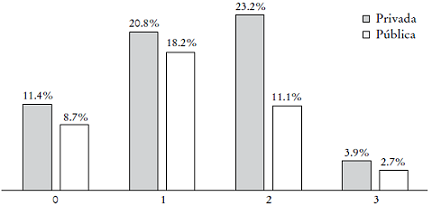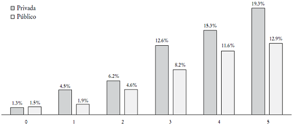 En el caso de tipo de escuela, nuestros resultados son similares a otros en el sentido de que el mayor porcentaje de respuestas positivas se alcanza en alumnos de escuelas privadas. No obstante, el patrón obtenido en las respuestas totales no se modifica y el porcentaje de aquellos estudiantes con dos puntos o más sigue siendo bajo.