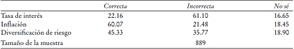 Otra sección importante de la encuesta es la valoración del alfabetismo financiero de acuerdo con el enfoque L&M. Aunque las tres preguntas de este enfoque forman parte del componente de conocimiento financiero en OCDE, las presentamos por separado, ya que han sido utilizadas en estudios de otros países y permiten comparaciones internacionales. Las tres preguntas que captan información sobre la comprensión de conceptos como inflación, tasa de interés compuesto y diversificación de riesgos, y que usamos con ligeras modificaciones para adaptarlas a las condiciones de México fueron las siguientes: