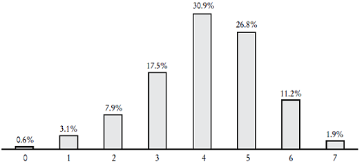 Las gráficas reportan la frecuencia de aciertos en este tema. En la Gráfica 4 se observa que sólo 2% de los alumnos pudo contestar todos los reactivos de forma correcta. Aproximadamente una tercera parte contestó al menos tres de los siete reactivos, mientras que otra tercera parte contestó cuatro reactivos de manera correcta. Es decir, sólo cuatro de cada 10 alumnos contestó correctamente 70% o más de los reactivos.