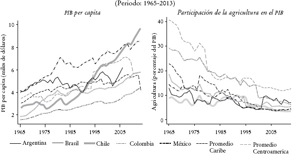 Existe una regularidad empírica muy bien documentada: conforme la economía de un país crece, la importancia relativa del sector agrícola disminuye (Johnston y Mellor, 1961; Anríquez y Stamoulis, 2007; Timmer, 2002). Por ejemplo, en 2010 la agricultura representaba, en promedio, 29% del PIB total en países con ingresos bajos (países con ingresos per cápita por debajo de 1 005 dólares); mientras que para los países de ingresos medios y altos representaba 10.5 y 1.5% (Alston y Pardey, 2014). La Gráfica 1 muestra, para un conjunto de países Latinoamericanos, que conforme el PIB per cápita aumenta, la importancia relativa del sector agrícola disminuye. Aunque la relación causal entre PIB y desarrollo agrícola es sumamente difícil de identificar, la correlación entre ambas es muy clara: una regresión de mínimos cuadrados ordinarios para el periodo de 1965 al 2013 para la región de América Latina y el Caribe muestra que un aumento de mil dólares de PIB per cápita se asocia con una caída de 0.11 puntos porcentuales en la importancia de la agricultura en el PIB.1